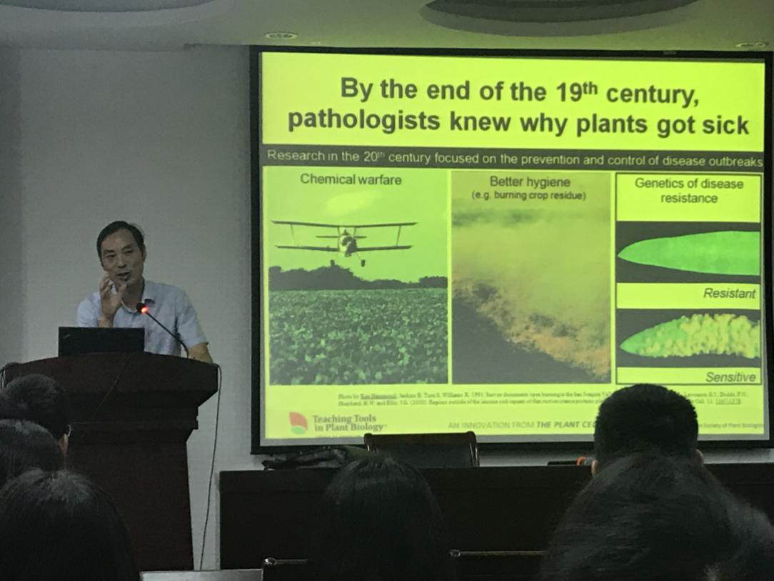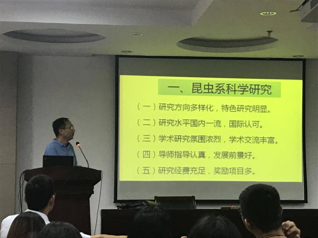 、2019届深造(保研和考研)政策简介两项议程。首先由植物病理学系教授窦道龙、昆虫学系教授王备新、农药系教授高聪芬老师从不同的学科研究方向为大家进行了简单的介绍,突显出植保学院悠久的发展历史、杰出的人才队伍、一流的科研平台、领先的研究方向、丰富的科研成果和人才走向,充分展示了学院实力。