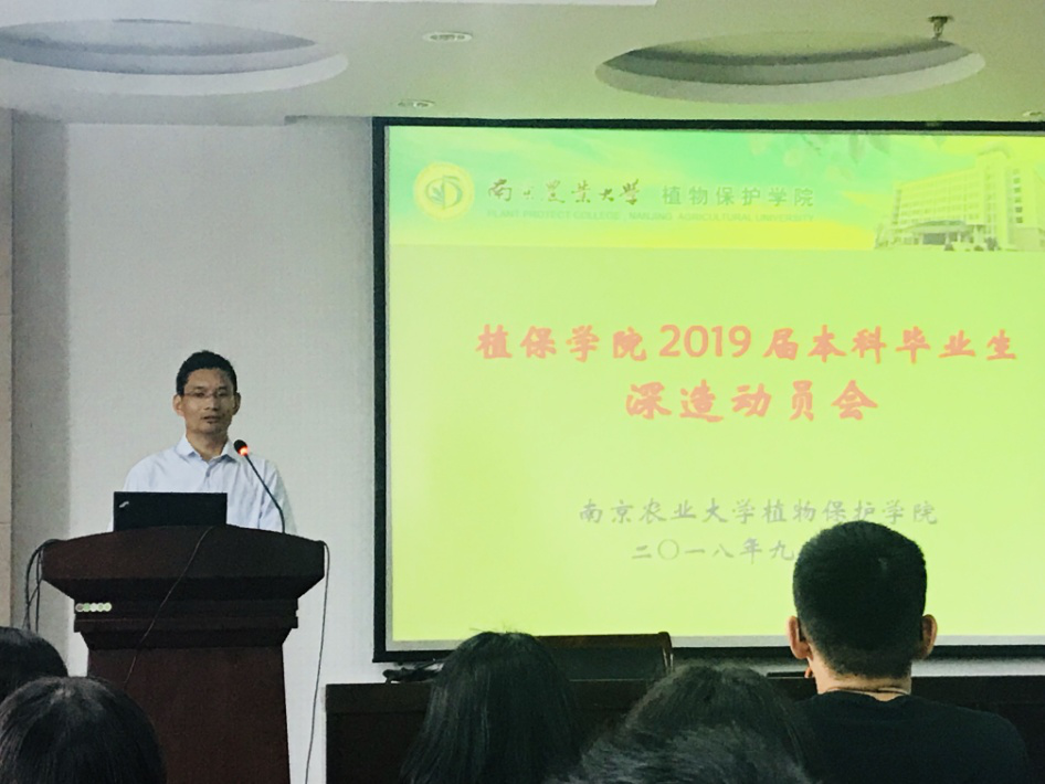 于理科楼C303召开了2019届本科毕业生深造动员会,2019届全体毕业生参加了此次大会。会议由学院党委副书记黄绍华主持,植物病理学系教授窦道龙、昆虫学系教授王备新以及副教授金琳、农药系教授高聪芬出席了本次会议。