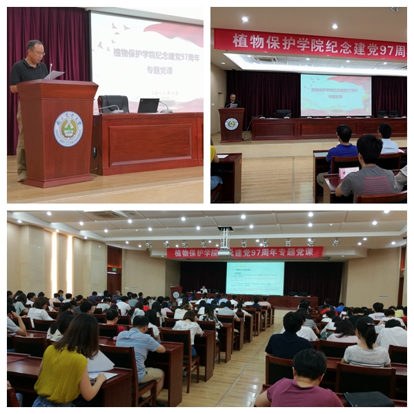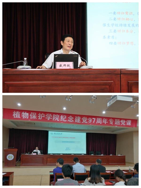 于金陵研究院三楼报告厅举办庆祝建党97周年师德师风教育专题党课,校党委副书记、纪委书记盛邦跃受邀主讲。学院党委书记吴益东主持,全体教职工及研究生党员参加学习。