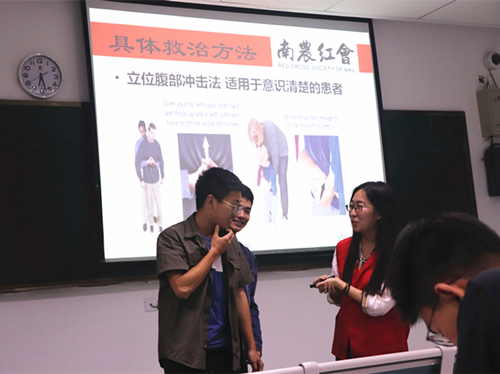 最后,杨雪详细介绍了有关“运动损伤”的知识,包括不慎扭伤,腰损伤时该如何应对。同时通过播放“海姆立克急救法”的视频,现场有请两位男生到台上演示,使同学们更加清楚异物卡喉的急救方法。