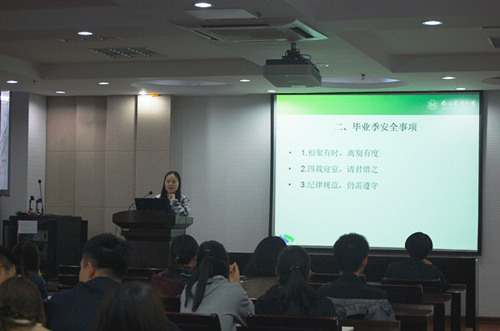 毕业生年级会议在理科楼C303举行,会议由植保院辅导员李艳丹主持,全体2014级毕业生参加。会议强调了临近毕业时应该注意的安全事项与档案问题。