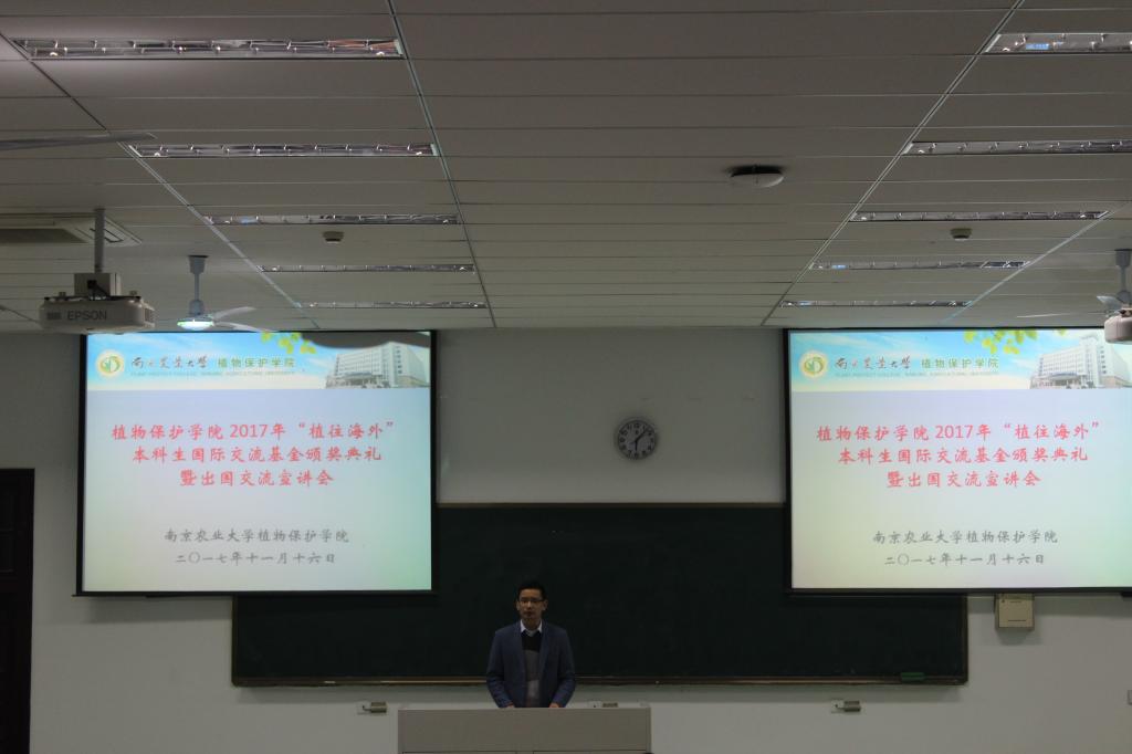 于主楼143举办2017年“植往海外”本科生国际交流基金颁奖典礼暨出国交流宣讲会。本次到场的嘉宾有国教院副院长童敏、植保院党委副书记黄绍华、植保院09年优秀校友Wonder Education校长李珂,以及植保院的辅导员和部分本科生。
