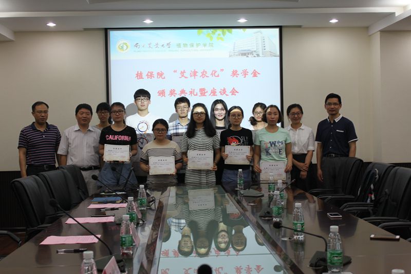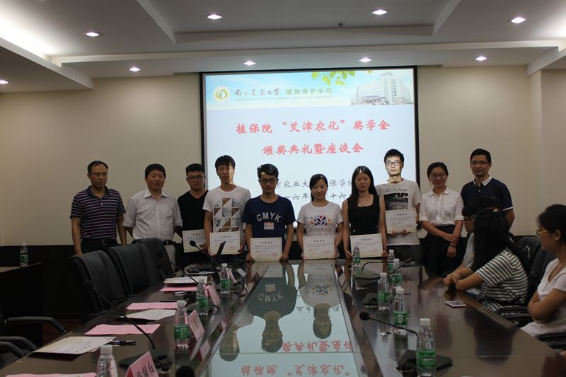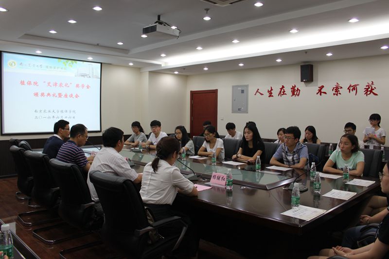 “艾津农化”奖学金颁奖典礼暨就业座谈会于理科楼C306报告厅圆满举行。植保院党委书记吴益东教授,江苏艾津农化有限责任公司副总经理屈继辉先生、人事经理杨继红女士出席本次座谈会,会议由植保院党委副书记黄绍华主持。