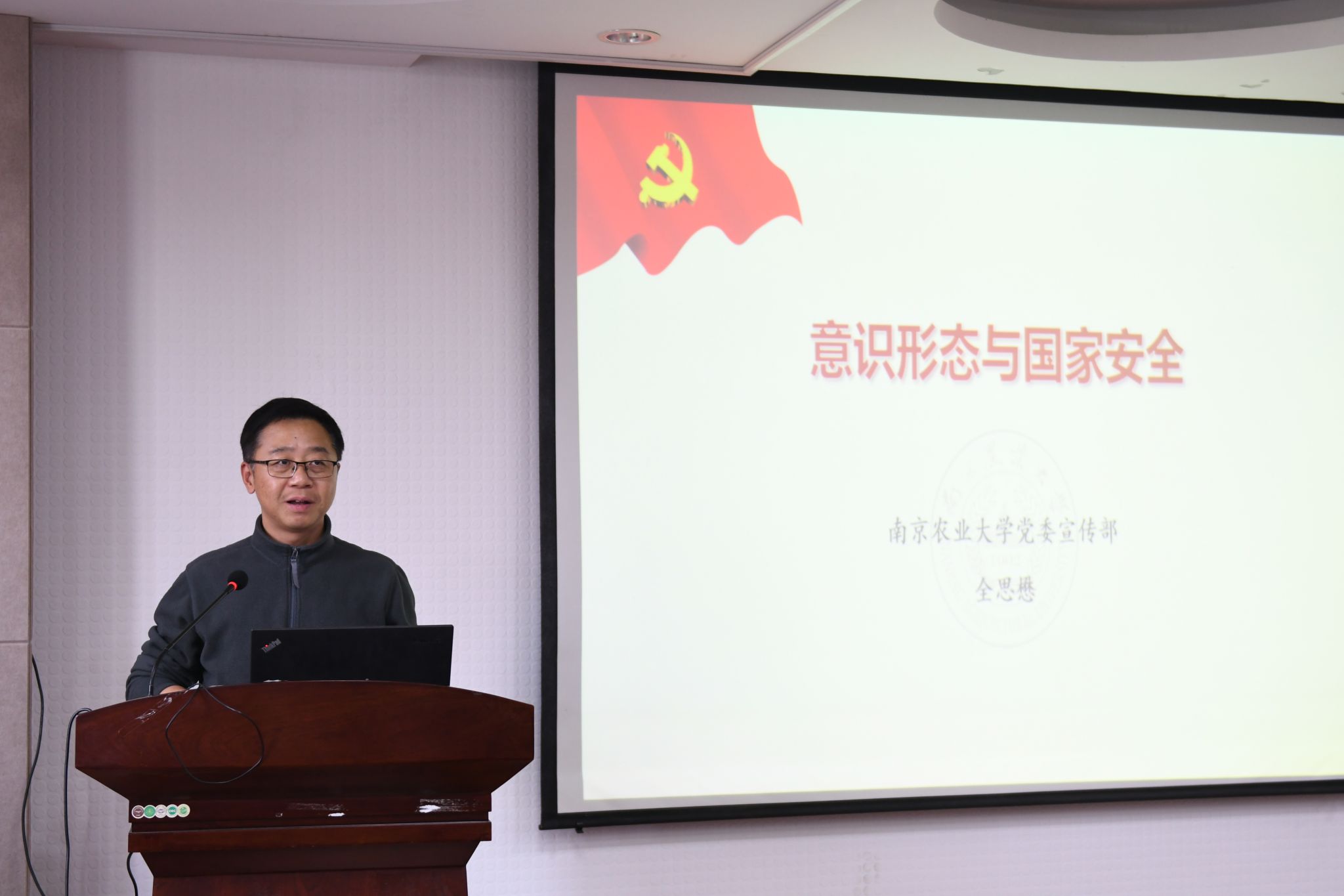会上,全思懋以《意识形态与国家安全》为题,首先向老师们强调了意识形态工作是党的一项极端重要的工作,是为国家立心、为民族立魂的工作。随后他从什么是意识形态、意识形态斗争的主要形式、当前我国意识形态工作面临的形势、当前意识形态领域存在的挑战、如何做好意识形态工作等五个方面,详细分析了当前意识形态领域面临的新情况、新问题、新风险、新挑战,深入浅出地讲解了筑牢意识形态安全防线,守牢意识形态阵地。