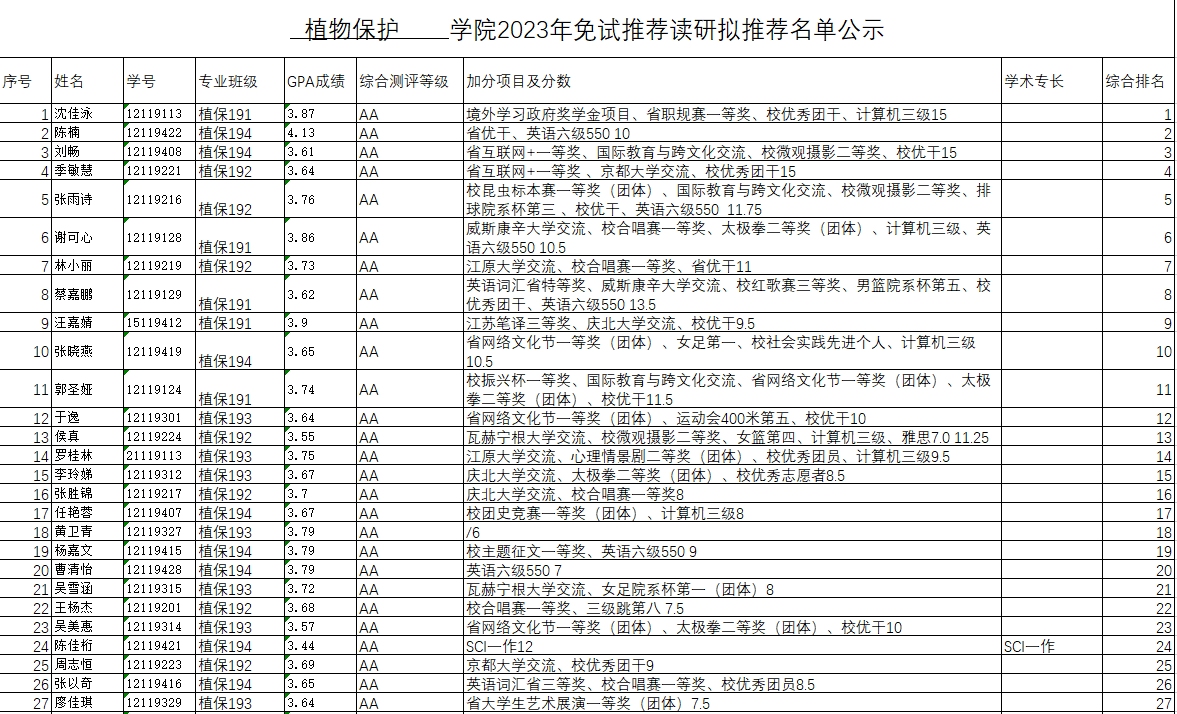 根据《南京农业大学关于做好2023年推荐优秀应届本科毕业生免试攻读研究生推荐工作的通知》文件精神,经学生自愿申请,学院初步审核以及资格认定答辩,依据《黑料网 2023年推荐免试研究生(含“直博生”)工作方案》综合排名,现将最终拟推荐名单公示如下(按综合成绩排名排序):